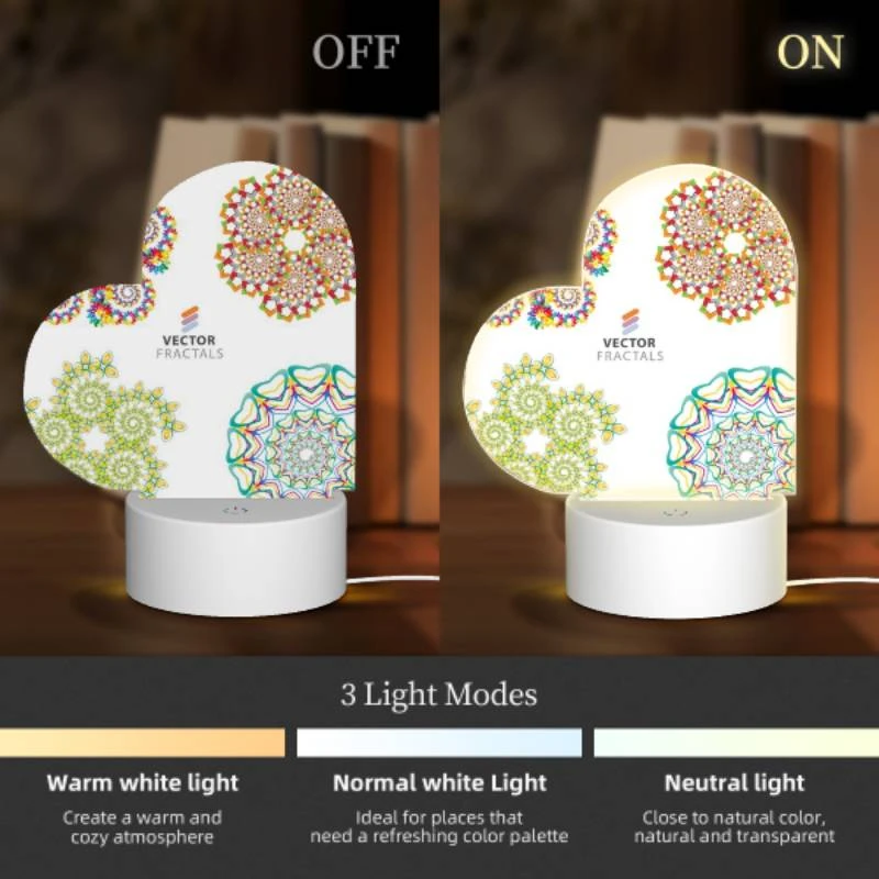 [Product Performance] The night light is composed of an acrylic light board and a plastic base. The night light has 3 light options (white light, warm light, warm white light). Touch to switch the light mode, which is soft and not dazzling, harmless to the eyes, and accompanies you into sweet dreams every night, creating a comfortable sleeping environment.
