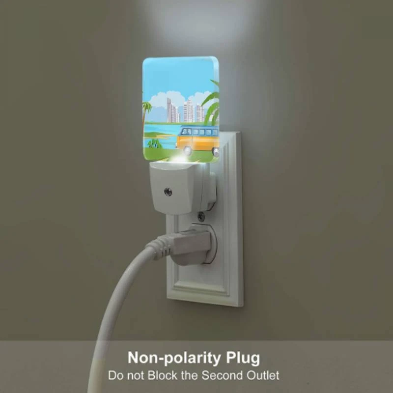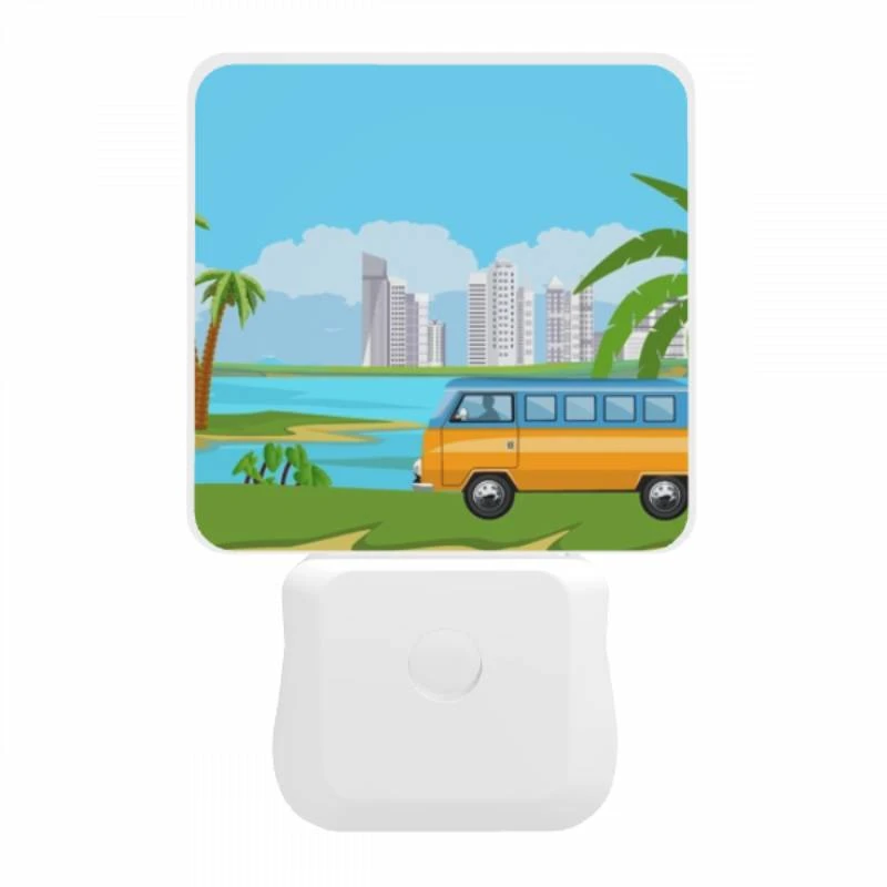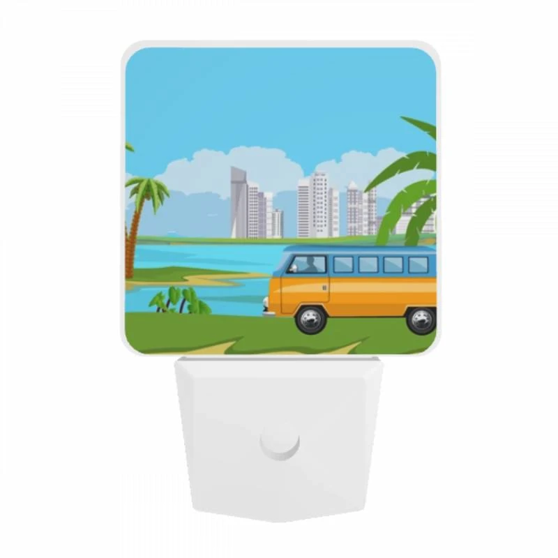 Night Light, A Colorful Cartoon Van Is Driving On A Road Near A Body Of Water.