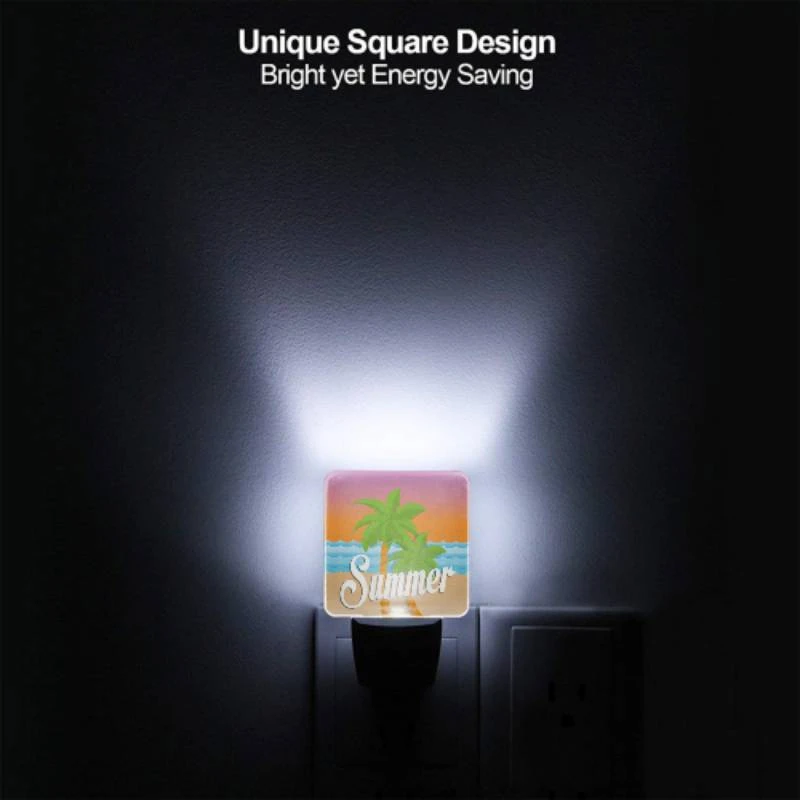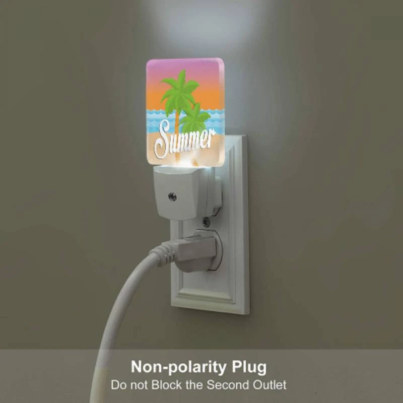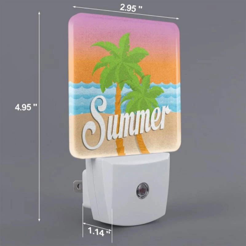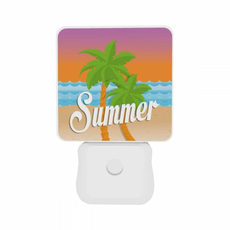 Night Light Set Of 2, A Colorful Cartoon Of A Palm Tree And The Word “summer” On A Beach.