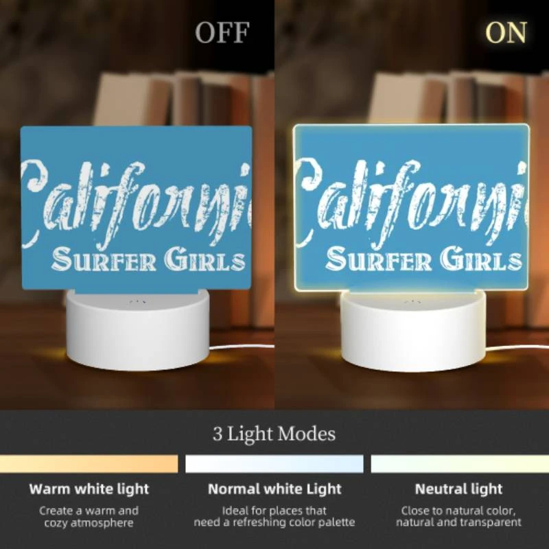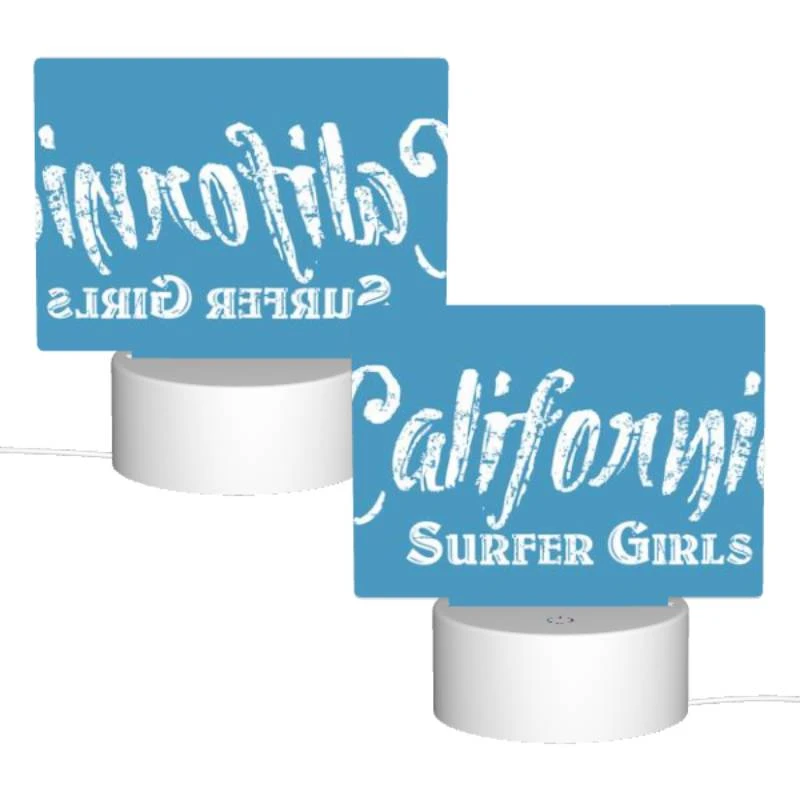 Rectangular Acrylic Night Light, A Blue Sign That Says “California Surfer Girls.”.
