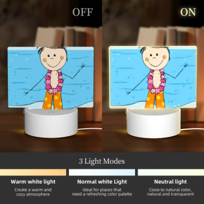 Rectangular Acrylic Night Light, A Cartoon Character Wearing A Lei And Shorts Is Standing On A Beach.