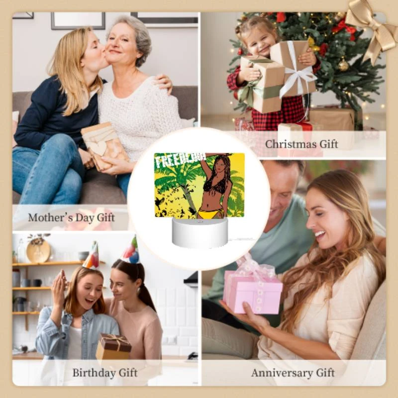 Be the first to review “Rectangular Acrylic Night Light, A Woman With A Yellow Bikini Is Standing In Front Of A Tree With Birds Flying Around Her.” Cancel reply