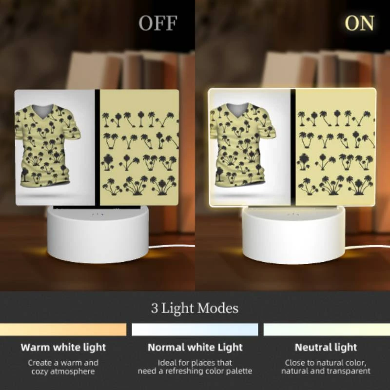 Rectangular Acrylic Night Light, A Yellow Shirt With A Picture Of Palm Trees On It.