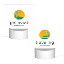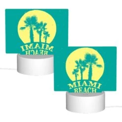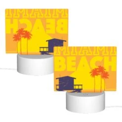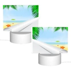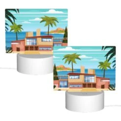 Rectangular Acrylic Night Light, A House Is Situated On A Beach With A Palm Tree In Front Of It.