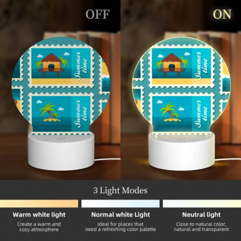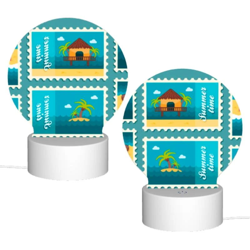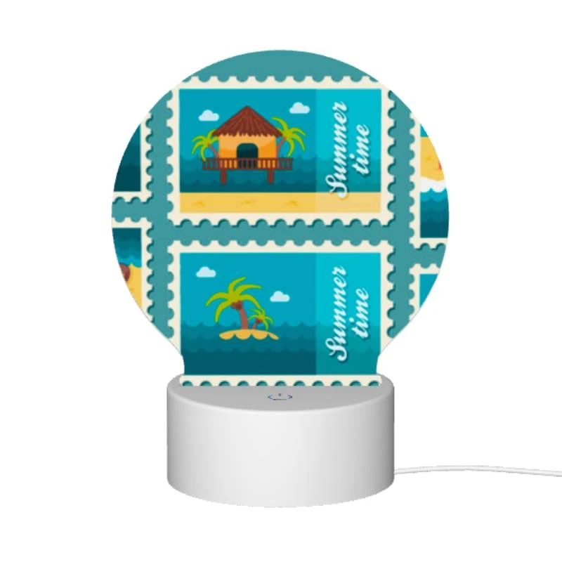 Round Acrylic Night Light, A Collection Of Six Different Colored Postage Stamps Featuring Beach And Tropical Themes.