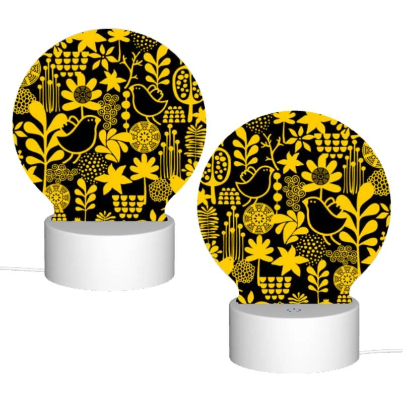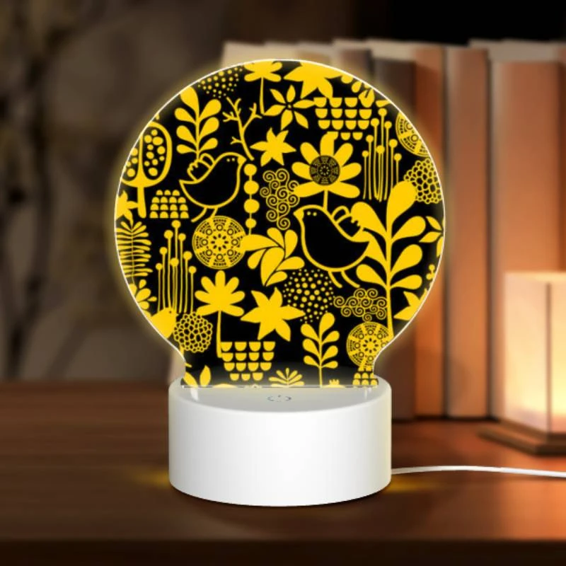 Round Acrylic Night Light, A Pattern Of Birds And Flowers On A Black Background.