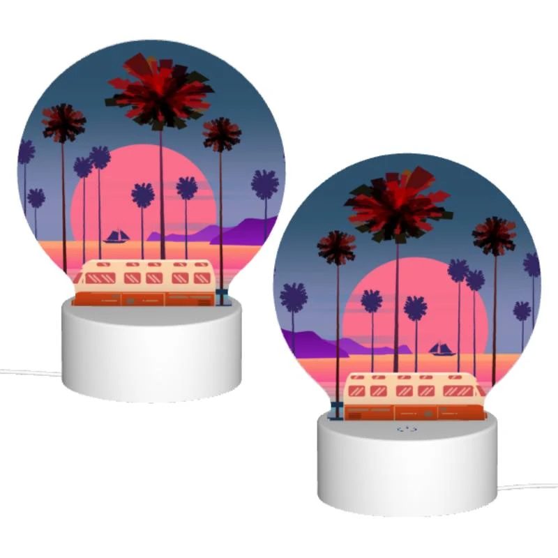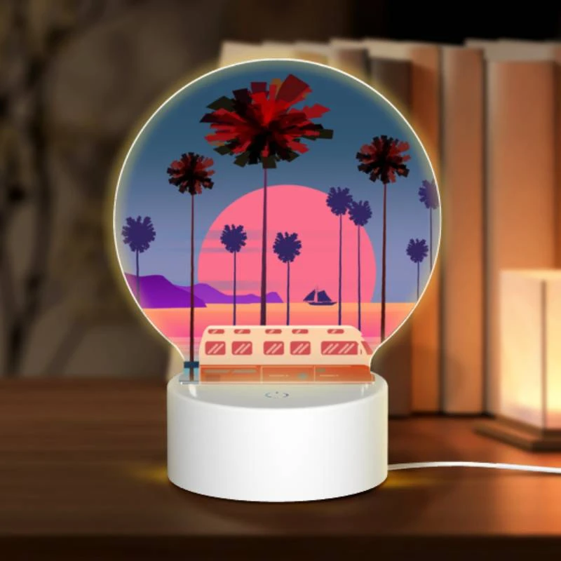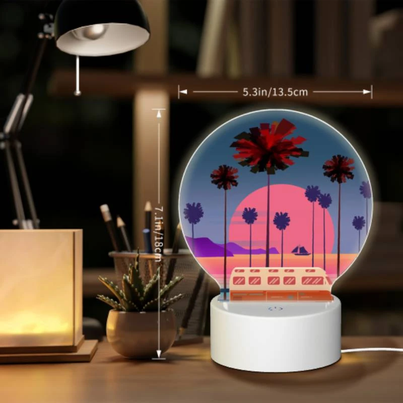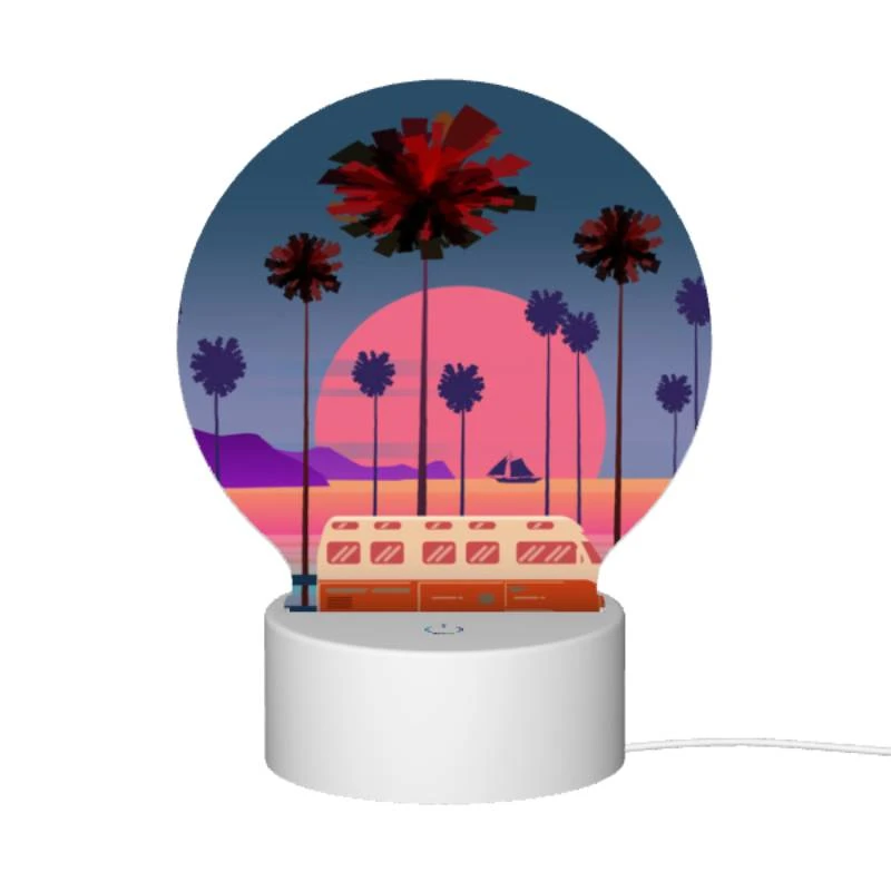 Round Acrylic Night Light, A Red And White Van Is Parked In Front Of A Palm Tree.
