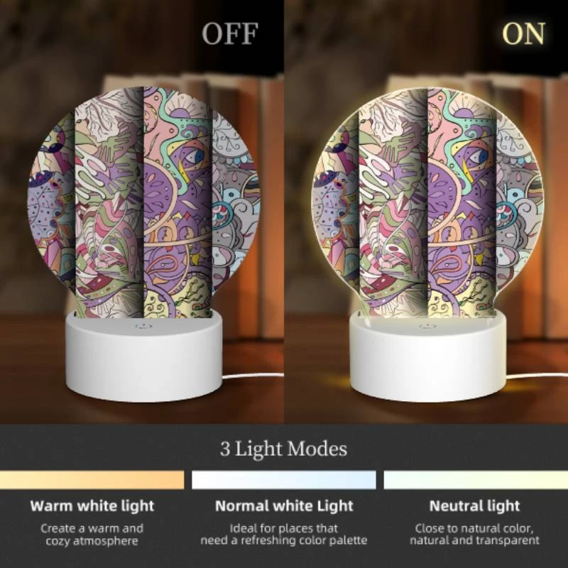 Round Acrylic Night Light, Three Colorful Designs Are Displayed Side By Side.