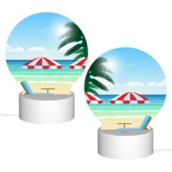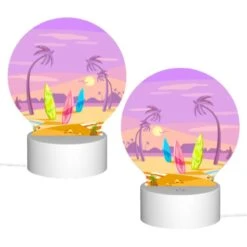 Round Acrylic Night Light, A Black And White Drawing Of A Hat With Two Palm Trees On Either Side.